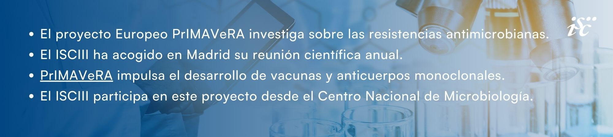 El Instituto de Salud Carlos III (ISCIII) ha acogido este mes de noviembre la 4ª reunión anual del proyecto europeo PrIMAVeRa (Predicting the Impact of Monoclonal Antibodies & Vaccines on Antimicrobial Resistance), una iniciativa internacional que pretende impulsar la lucha contra la resistencia a antimicrobianos (AMR, por sus siglas en inglés), uno de los mayores desafíos actuales para la salud pública, y el desarrollo de vacunas y terapias como el uso de anticuerpos monoclonales (mAbs).
