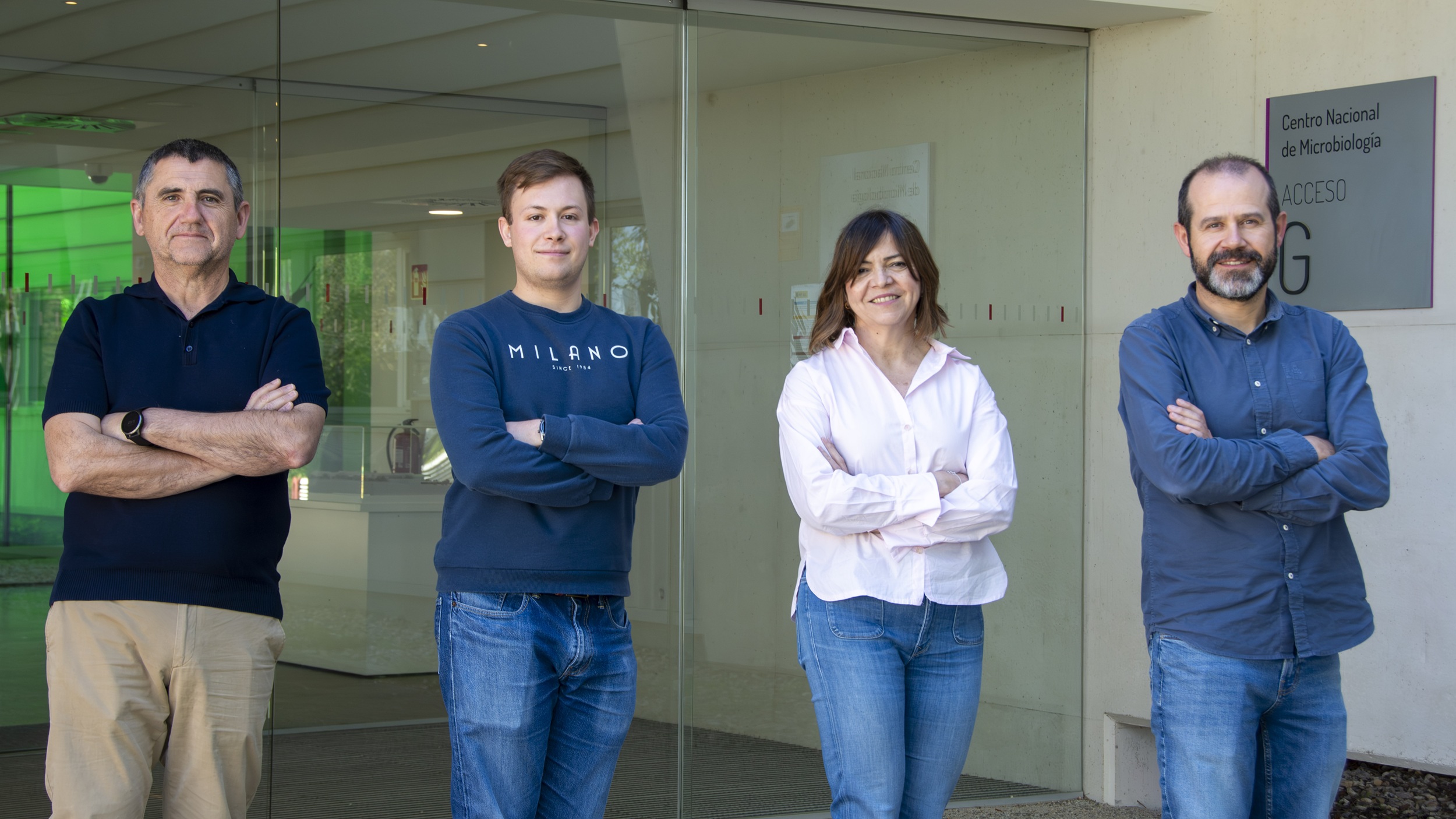 Luis Miguel González, Aitor Gil, Estrella Montero y Sergio Sánchez, autores de la publicación, en una de las puertas del Centro Nacional de Microbiología (CNM) del ISCIII.