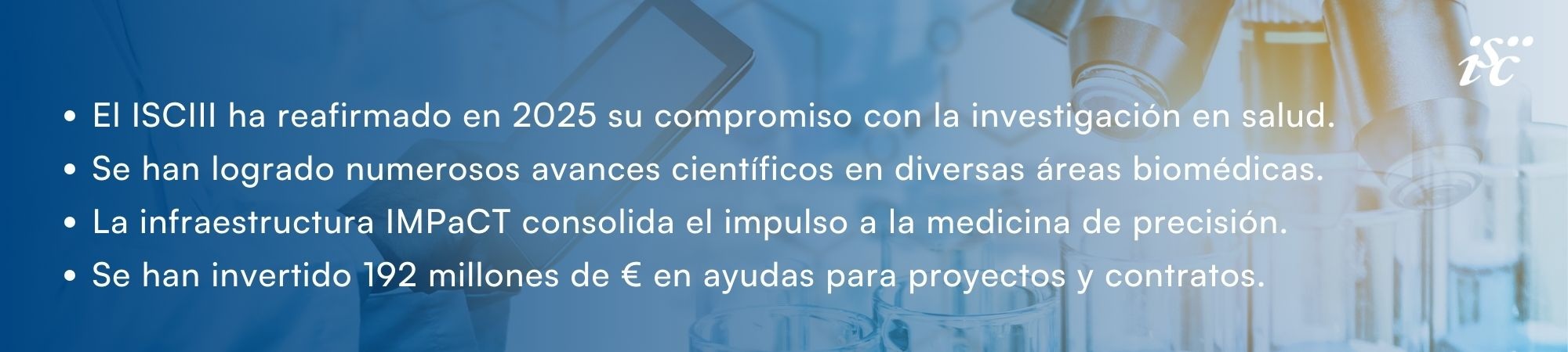 Un año más, en 2025 el Instituto de Salud Carlos III (ISCIII), como principal Organismo Público de Investigación en el ámbito de la salud pública y la biomedicina, ha seguido desarrollando y reforzando sus cuatro ejes principales: investigación biomédica y sanitaria, financiación de la ciencia, formación y asesoría, y prestación de servicios científico-técnicos.